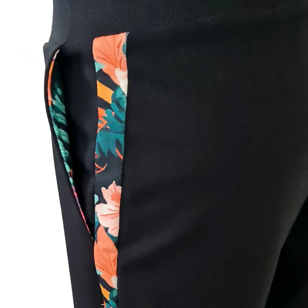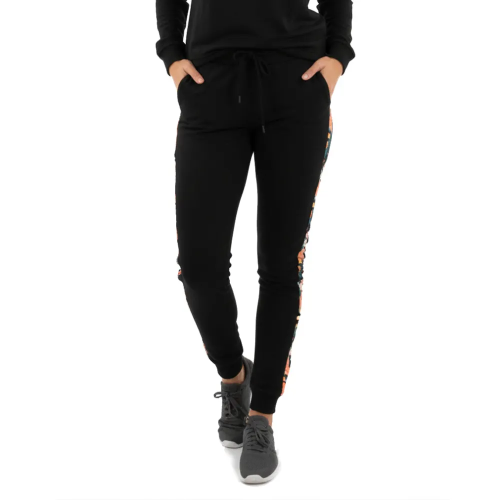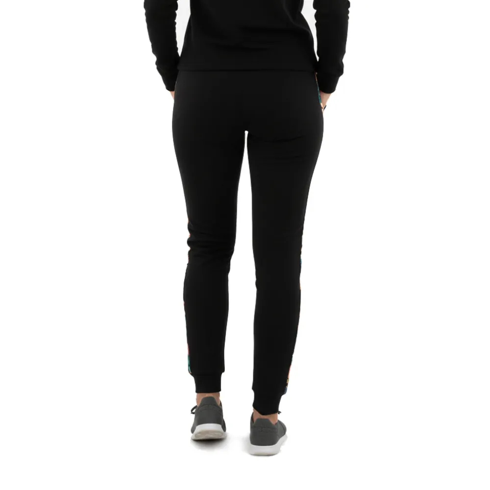 Dámské černé tepláky, které nejsou jen základ, ale plnohodnotný designový kus. Po celé délce nohavic je vsazený boční pruh z našeho originálního grafického materiálu, díky kterému tepláky tvoří dokonale sladěný set s mikinou: "Barrsa Comfort"ze stejné kolekce. Prvek nepůsobí jen jako detail – opticky prodlužuje nohy a dává outfitu výrazný, městský charakter.